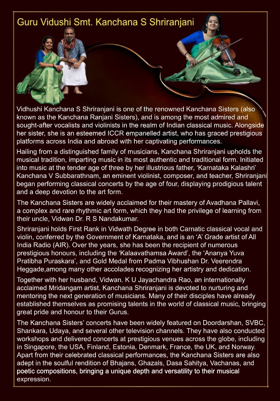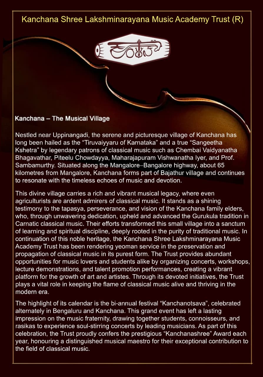 Recognized and respected in Bengaluru as well as its native town Kanchana, the Academy is deeply passionate about teaching Carnatic music and organizing cultural initiatives such as Kanchanotsava and Gurukula Workshops. These events foster enthusiasm, creativity, and a deep love for learning among students.