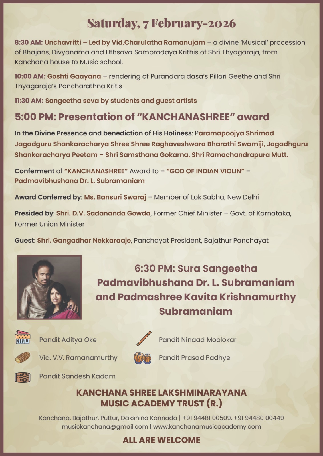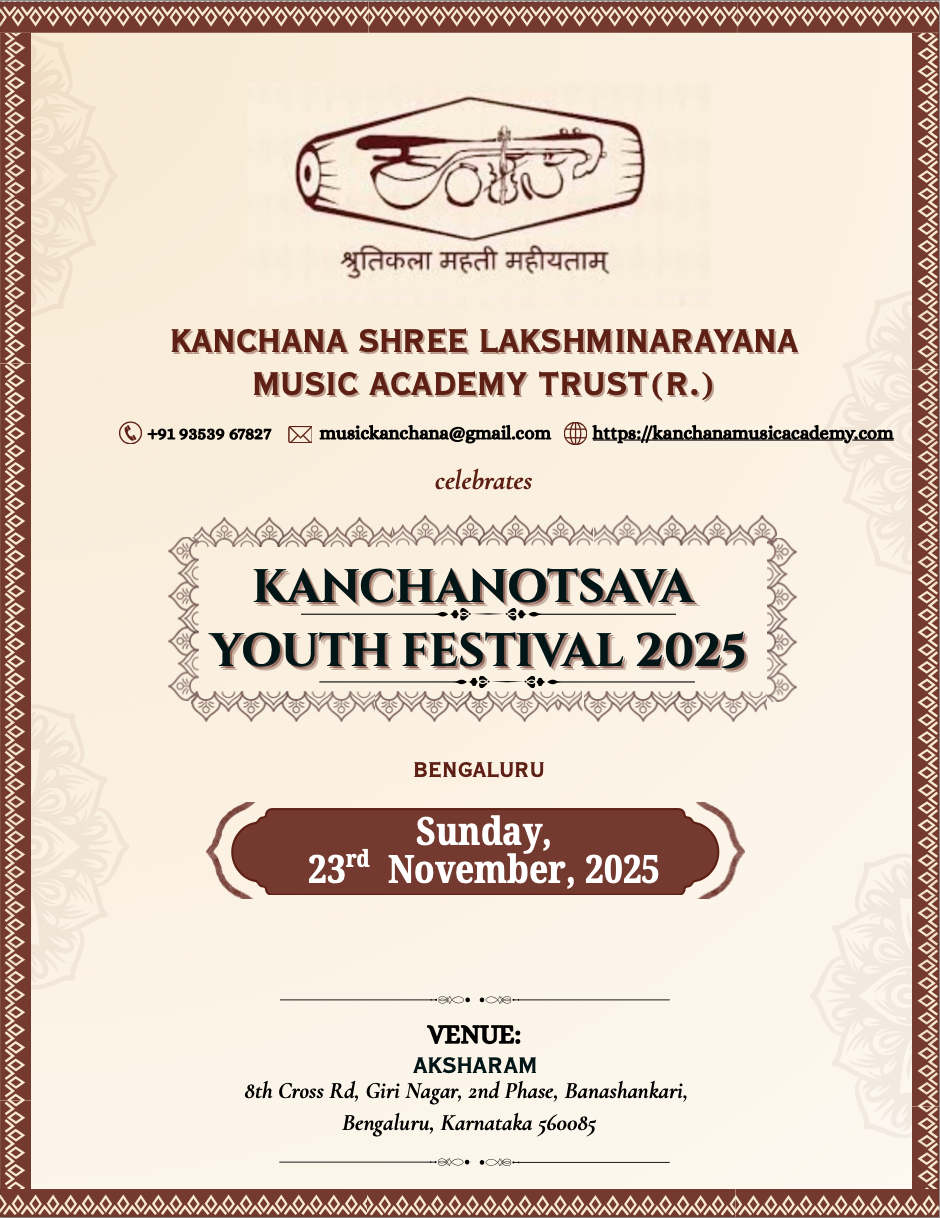 Recognized and respected in Bengaluru as well as its native town Kanchana, the Academy is deeply passionate about teaching Carnatic music and organizing cultural initiatives such as Kanchanotsava and Gurukula Workshops. These events foster enthusiasm, creativity, and a deep love for learning among students.