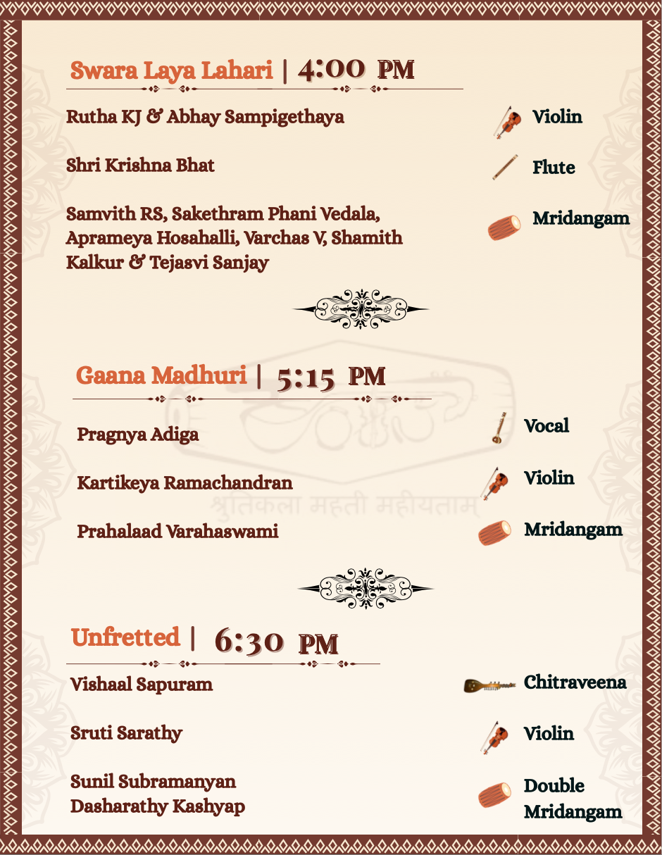 Upholding decades of tradition and dedication to students, the trust continues to provide rigorous training in Karnataka sangeetha music including Vocal, Mridangam, Violin, Konnakol, and Tabla